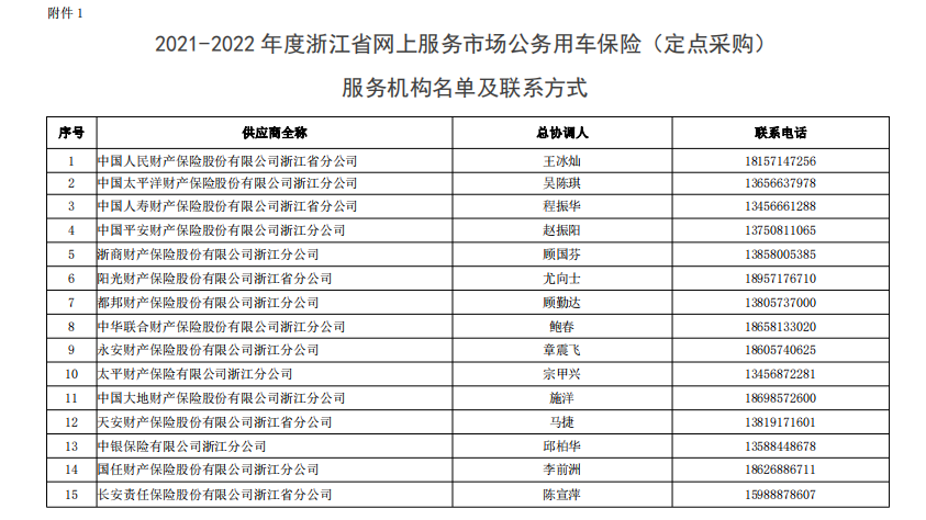 服務協議期自《2021-2022 年度浙江省網上服務市場公務用車保險(定點采購)項目框架協議》(範本詳見附件 3)生效之日起,至 2022 年 12 月 31 日止。入圍保險機構共 15 家(聯係方式詳見附件 1),分別為: