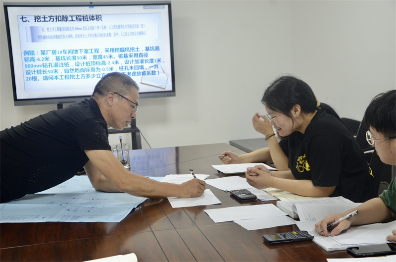 在講完以上幾方麵知識後,邵增躍開始點評學員的預習作業——《年產500套高精電子模具車間建設項目》工程結算書裏計算稿土方部分的內容。先是學員們互評,找到彼此答題的錯誤之處;邵工再一一進行講解,直到所有學員都明白為止。