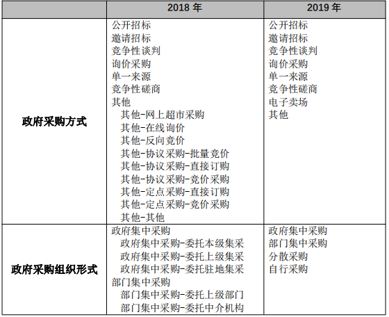 按照政府采購法及其實施條例的規定,並結合浙江省政府采購信息化建設的成果,簡化金財工程政府采購管理係統(內網)政府采購計劃的編製。將政府采購 組織形式從2018年的10類簡化為政府集中采購、部門集中采購、分散采購和自行 采購4類;政府采購方式從2018年的15種簡化為公開招標、邀請招標、競爭性談判、 詢價、單一來源采購、競爭性磋商、電子賣場和其他8種(詳見表1)。