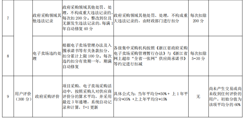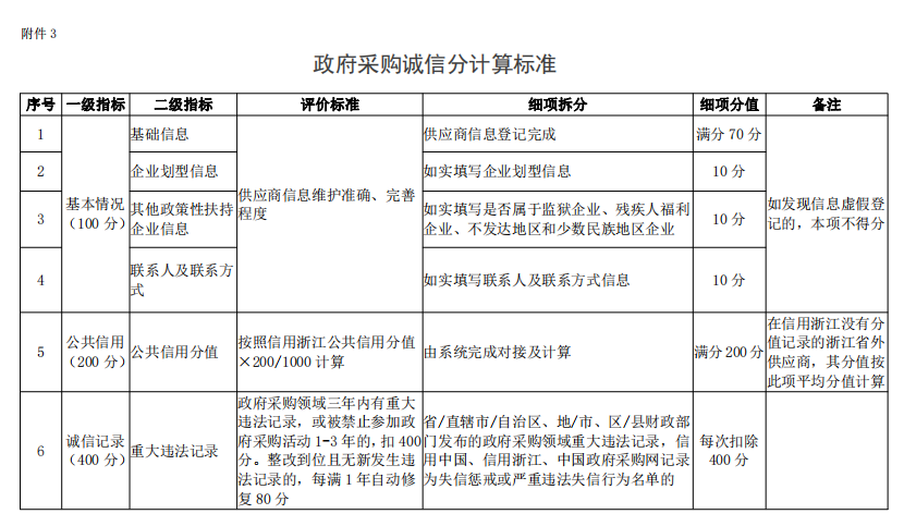 (一)浙江省政府采購供應商按統一標準設置“政府采購誠信分”,總分為 1000 分,由基本情況、公共信用情況、誠信記錄和用戶評價等一級指標組成,一 級指標下各設若幹個二級指標。政府采購誠信分為 A、B、C、D、E 五個級別,其中A 級為政府采購紅名單。政府采購誠信級別劃分和誠信分計算標準詳見附件 2、 3,並將根據運行情況不定期更新,同步公布於浙江政府采購網。