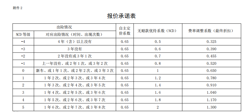 2.費率調整係數=無賠款優待係數×自主定價係數 x 交通違法係數(說明:浙江地區交通違法係數取 1)。 3.無wu賠pei款kuan優you待dai係xi數shu根gen據ju車che輛liang實shi際ji出chu險xian情qing況kuang和he連lian續xu投tou保bao年nian度du曆li史shi賠pei款kuan記ji錄lu,按an照zhao無wu賠pei款kuan優you待dai係xi數shu對dui照zhao表biao進jin行xing費fei率lv調tiao整zheng。由you行xing業ye主zhu管guan部bu門men或huo行xing業ye協xie會hui統tong一製定頒布,由行業平台自動返回。
