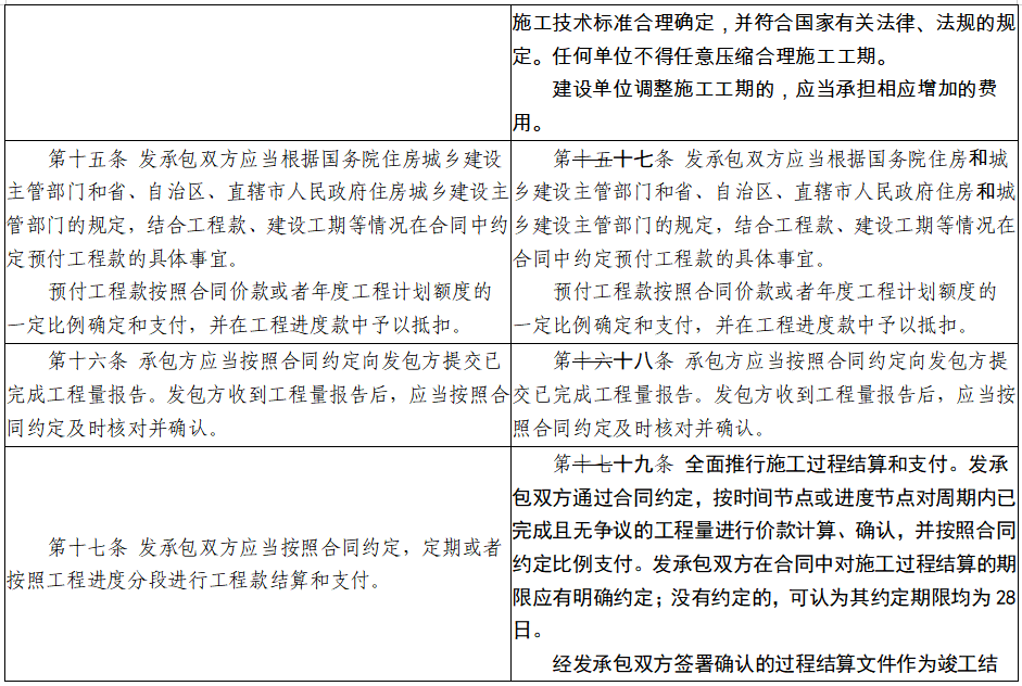 為貫徹落實國務院決策部署,進一步做好清理政府部門和國有企業拖欠民營企業中小企業賬款工作,增加推行建築工程施工過程結算的條款。明確過程結算的內容,規定過程結算開展的基本流程和時限要求,提出不得以未完成政府審計作為延期結算理由。