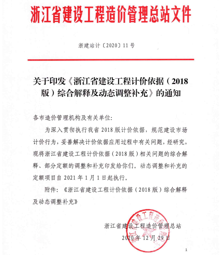 為深入貫徹執行我省2018版計價依據,規範建設市場計價行為,妥善解決計價依據應用過程中有關問題,經研究,現將浙江省建設工程計價依據(2018版)相關問題的綜合解釋、部分定額的調整和補充印發給你們。動態調整和補充的定額項目自2021年1月1日起執行。
