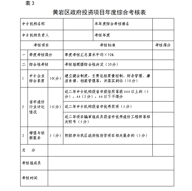 年nian度du綜zong合he考kao核he是shi對dui年nian度du內nei所suo有you參can與yu政zheng府fu投tou資zi項xiang目mu預yu結jie算suan編bian審shen的de中zhong介jie機ji構gou,在zai季ji度du考kao核he基ji礎chu上shang,結jie合he年nian度du內nei建jian設she工gong程cheng造zao價jia主zhu管guan部bu門men對dui中zhong介jie機ji構gou的de綜zong合he素su質zhi、省市造價行業評比情況(如中介機構造價谘詢質量信用評價、品牌和優秀企業的認定、造價人員從業行為評定等)、增值與創新服務等進行綜合考核(詳見表3:《黃岩區政府投資項目年度綜合考核表》)。