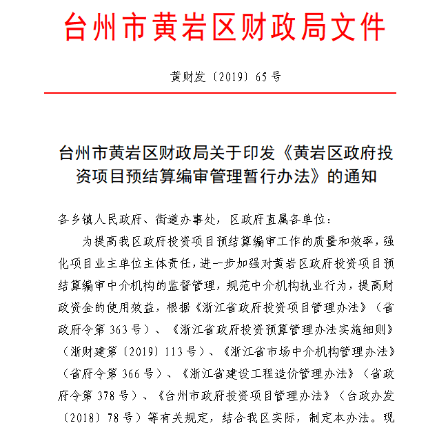 第一條 黃岩區政府投資項目預結算編審管理,適用於本辦法。