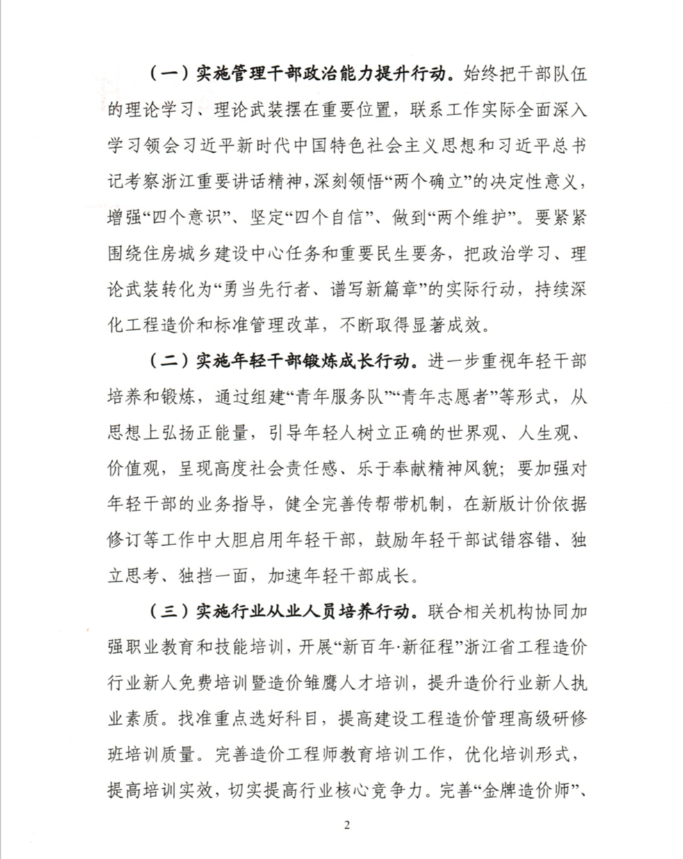 (二)實施年輕幹部鍛煉成長行動。進一步重視年輕幹部培養和鍛煉,通過組建“青年服務隊”“青年誌願者”等形式,從思想上弘揚正能量,引導年輕人樹立正確的世界觀、人生觀、價值觀,呈現高度社會責任感、樂於奉獻精神風貌;要加強對年輕幹部的業務指導,健全完善傳幫帶機製,在新版計價依據修訂等工作中大膽啟用年輕幹部,鼓勵年輕幹部試錯容錯、獨立思考、獨擋一麵,加速年輕幹部成長。